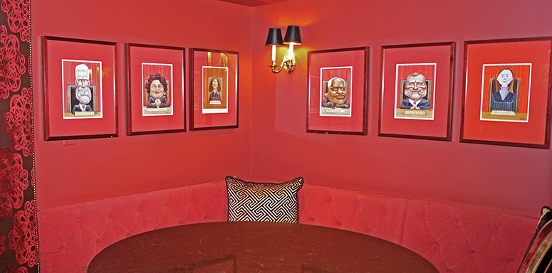 In addition to the clientele, Off the Record is known for its eye-popping red décor. Everything from the couches to the walls are some shade of red similar to the old Russian Tea Room in New York City. As for prime places to sit, have a drink, and share appetizers, Off the Record has a table behind the bar called “The Bench” surrounded by the Supreme Court Justices’ caricatures. It’s the most popular table in the place.