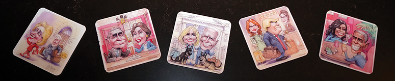 But the most popular feature is not the booths or the fancy bar or cool lighting. It’s the caricatures that hang on the wall – caricatures that also are on full display on the bar’s coasters. The stylized drawings of previous and current political figures were made by a trio of celebrated cartoonists: Kevin Kallagher of The Economist, Ann Telnaes of the Washington Post, and Politico’s Matt Wuerker. Roig remarks, “Everybody goes to Off the Record for one of these coasters. So often, we get people coming in who say, ‘I’ve brought my friends, and we love these coasters!’ It’s become a real thing.”